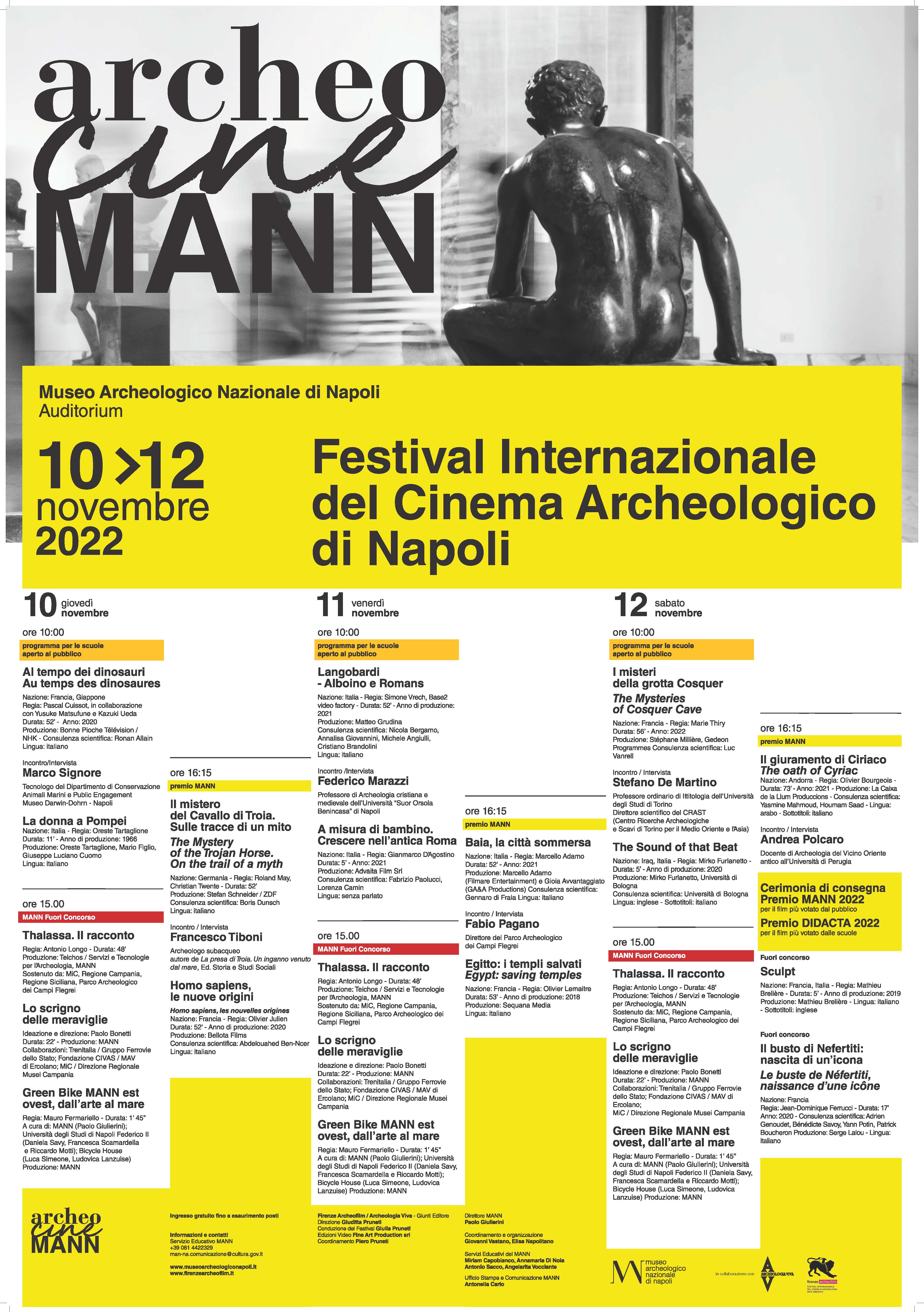ArcheocineMANN sarà arricchito da un programma per tutti, come sottolinea il direttore di “Archeologia Viva”, Piero Pruneti: “Siamo felici di tornare a organizzare a Napoli e proprio al MANN questo Festival internazionale. Il MANN è una sede privilegiata e, al tempo stesso, è la casa naturale di un cinema d’autore per raccontare il passato dell’uomo in maniera avvincente e -ravvicinata-. È un programma pensato anche per giovani e scuole che saranno protagonisti e parte attiva di questa edizione 2022“.