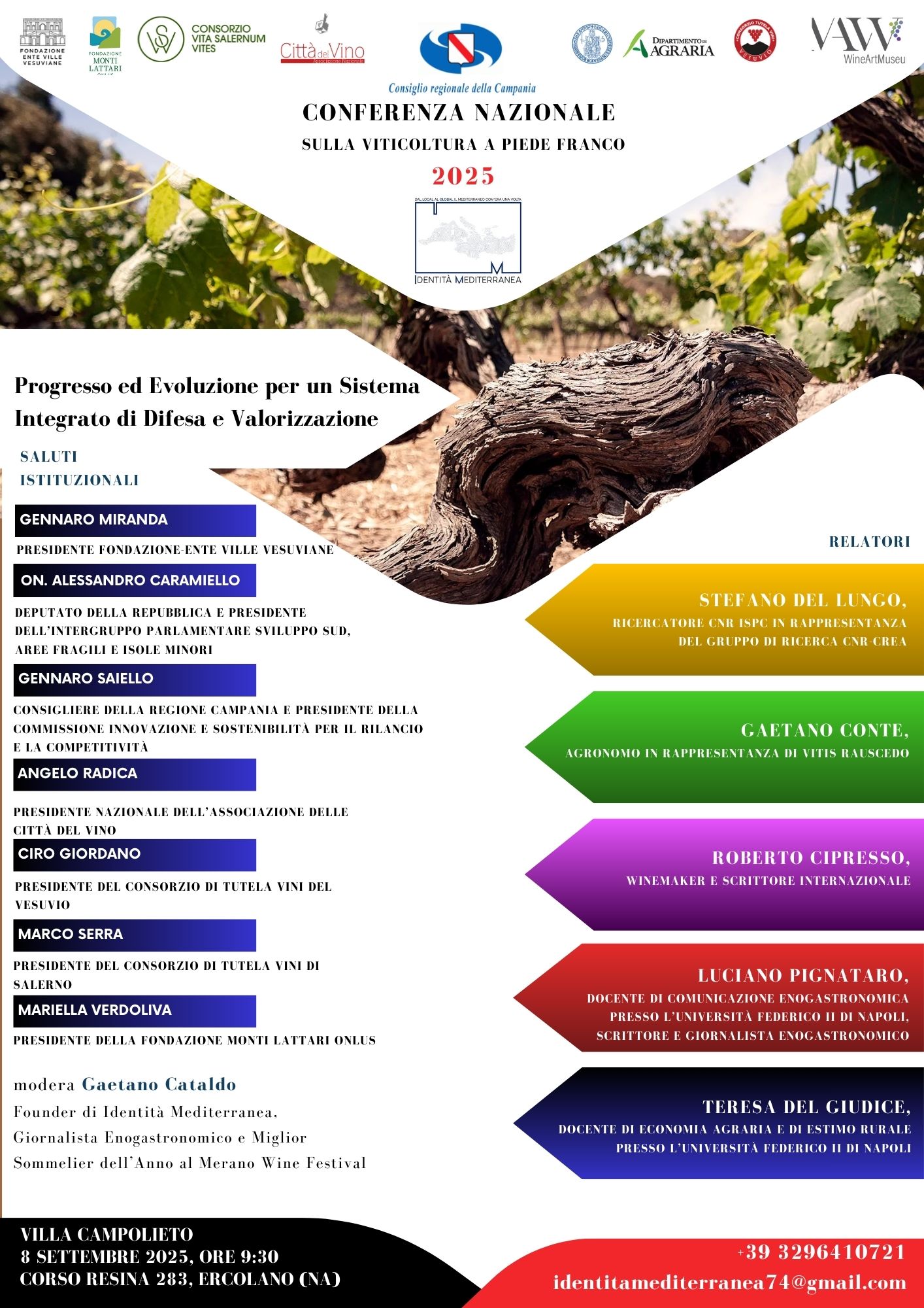 Giordano, Presidente del Consorzio di Tutela dei Vini del Vesuvio, e Marco Serra, Presidente del Consorzio di Tutela dei Vini di Salerno. Un ricco parterre di docenti, scienziati, responsabili di associazioni del territorio, enologi e giornalisti di settore che affronteranno il tema dei vitigni a piede franco, di grandissimo interesse per i molteplici sviluppi che possono nascere dalla sua valorizzazione. Infatti, a dare un ulteriore contributo per la divulgazione della conoscenza sulla viticoltura a piede franco, ci saranno Stefano Del Lungo, ricercatore e archeologo, da sempre impegnato nello studio sulla trasformazione di territori e insediamenti fra Antichità e Alto Medioevo, approfondendo viabilità, biodiversità culturale, inclusa la viticoltura tra archeologia e biologia molecolare, nel Mezzogiorno, Gaetano Conte, agronomo esperto con una visione multidisciplinare della viticoltura, e la professoressa Teresa Del Giudice, docente di Economia Agraria, Alimentare e Estimo Rurale, con esperienza pregressa nelle Scienze Agrarie e nell’Agribusiness.