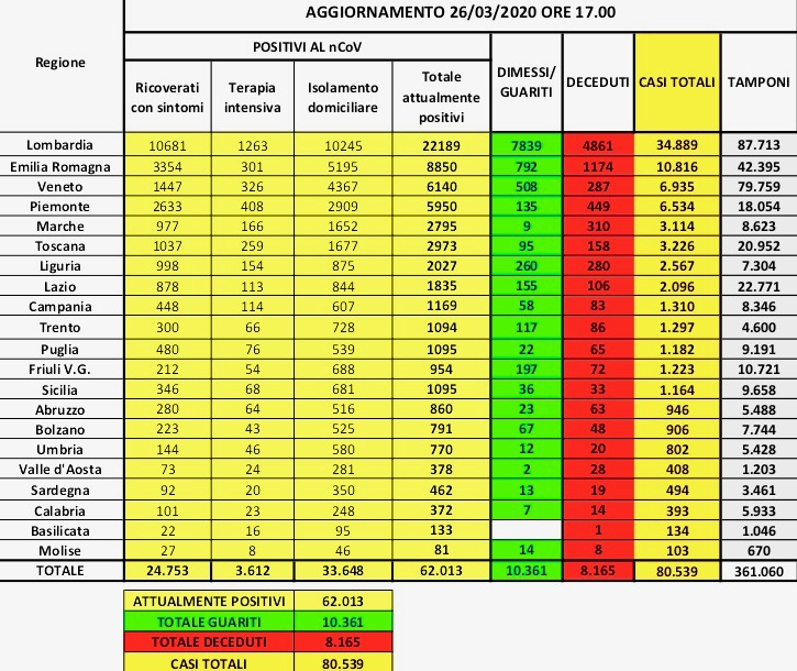 Italia: siamo giunti a 80539 contagiati, 8165 morti. Questo il bollettino di guerra odierno. Prosegue la carneficina, nonostante le speranze riposte in una curva discendente che ancora non giunge a rasserenare gli animi e ad evitare altre lacrime che si aggiungono alle tante già versate, e a quelle che continuiamo a versare per chi ci lascia.
