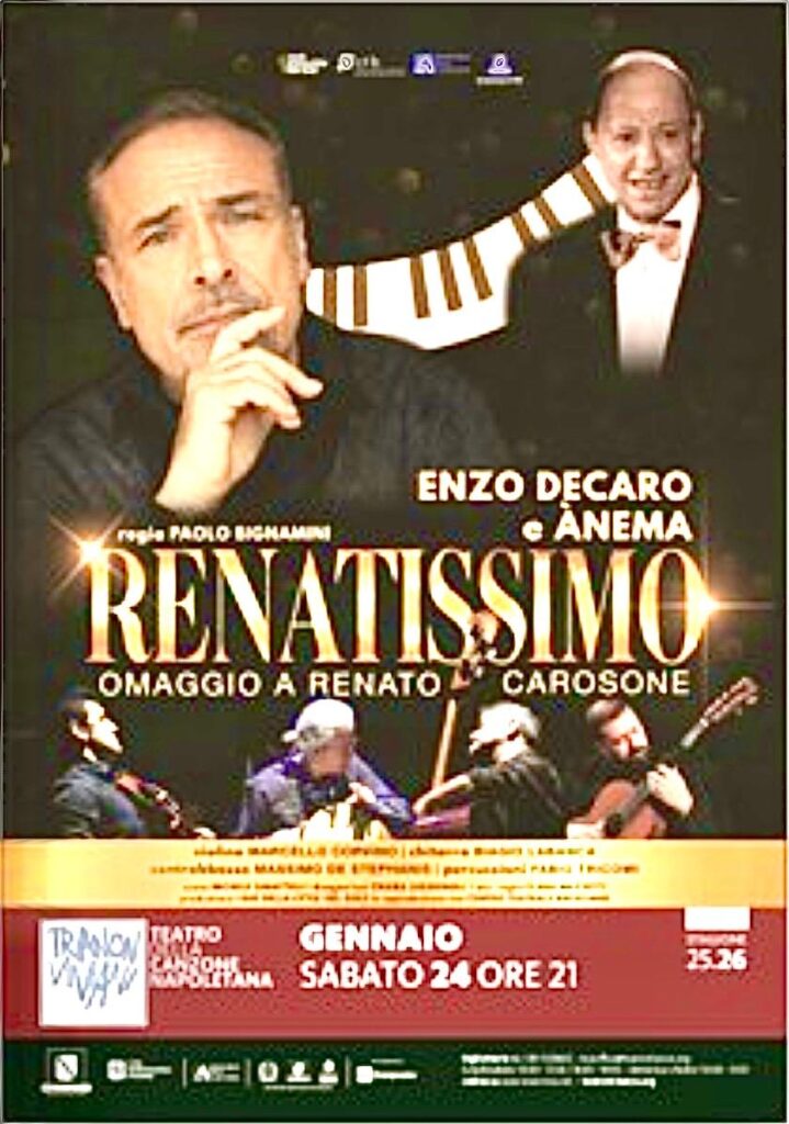 In “Renatissimo”, Enzo Decaro è sia narratore che cantante, rivestendo un duplice ruolo nel quale conduce lo spettatore alla scoperta della vita artistica e di quella privata di Carosone, coinvolgendolo in un racconto intrigante tra l’incredibile e il surreale, costruito con abilità e taglio comico di qualità su aneddoti e vicende biografiche.