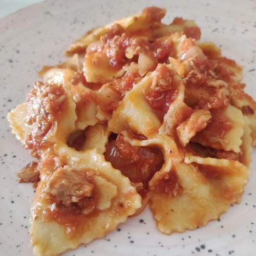 In una padella con un po’ di olio evo e il peperoncino far andare dolcemente la cipolla, dopodiché aggiungere il tonno sgocciolato, la polpa di pomodoro, un pochino di acqua, regolare di sale e prezzemolo e lasciar cuocere a fiamma bassa.