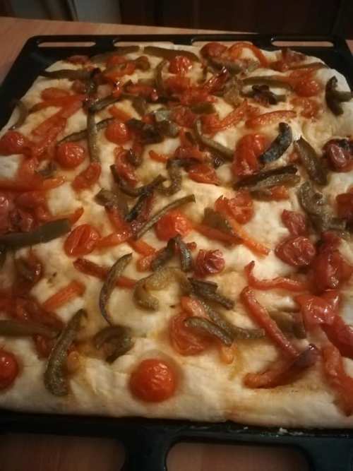 La focaccia è il sostituto del pane più gradito, se poi fatto in casa ancora più genuino e, se poi, la si farcisce come questa focaccia con peperoni e pomodorini, diventa anche piatto unico.
