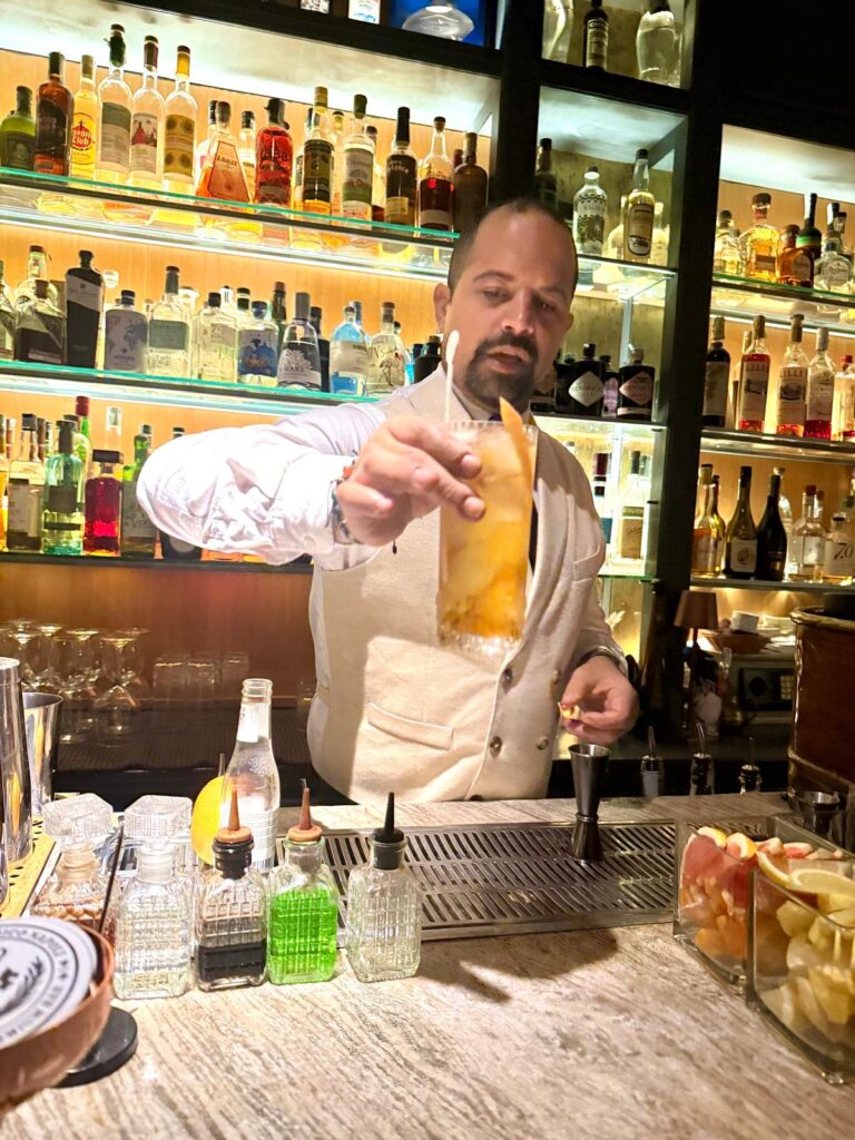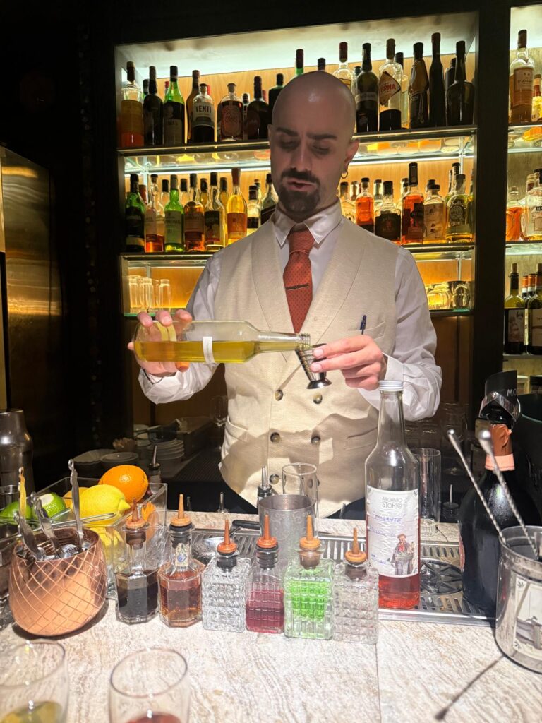 Mixology con il bar tender gourmet Mirko Lamagna che ha presentato il suo cocktail Brigante, miscela audace molto apprezzata dai presenti, a base di gin, mezcal, olio d’oliva, lampone e cacao, a simboleggiare lo spirito originale e spiccatamente avventuroso del Grand Tour, mirati anche ai piaceri terreni, nella scoperta e conoscenza complessiva del territorio. A presentarlo con ottima competenza specifica è stato il bar tender resident Antonio La Pietra.