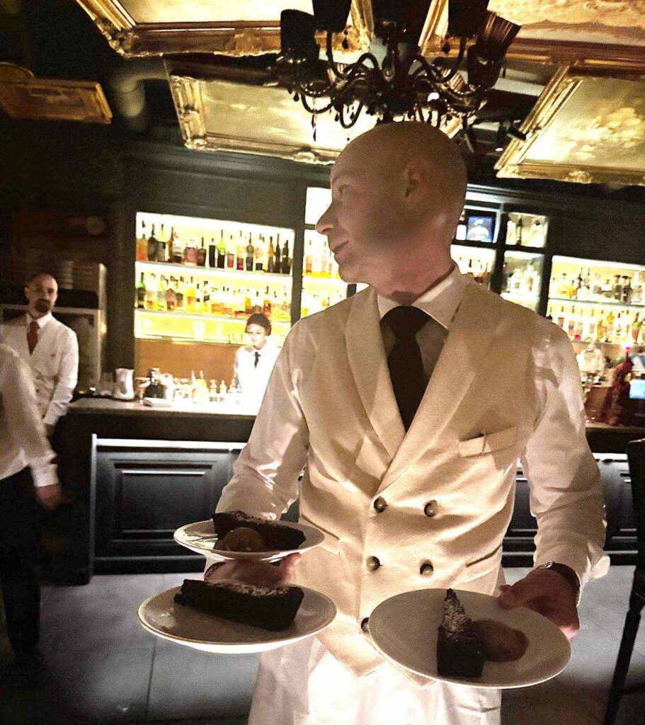 Ispirato ovviamente al Grand Tour il menu della serata, firmato dallo chef Emanuele Esposito che ha reinterpretato “felicemente” la tradizione, a partire dal “Mare a Corte”, bruschetta dai sapori mediterranei del Sud Italia, con alici, pomodoro, capperi e un tocco esotico di uva sultanina. Poi, la “Mescafrancesca” di pasta con totani, patate e olive nere caiazzane. Di seguito, “La patata del Grand Tour”, cotta sotto la cenere, con hummus di ceci e salsa chimichurri. Per dessert, la “Nera di Capri”, torta caprese al cioccolato con gelato fondente, ossequioso omaggio alla pasticceria regionale della Campania.