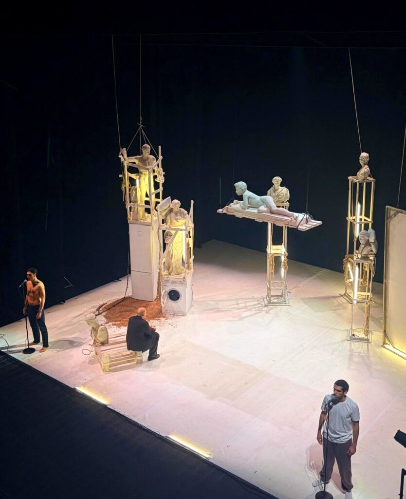 In 105 minuti con “La città dei vivi” la regia attraversa sulla scena la vita di Roma, città che nasce sopra le rovine di una città antica e che viene divorata dal suo stesso passato, come inghiottita dal suo stesso suolo. Mostra tutti gli innumerevoli conflitti: dal suono dei cori calcistici, alla storia antica, dal candore delle statue di marmo immortali simbolo di un passato glorioso, fino all’abisso dello stupro di giovani corpi, fino alla tortura, al dolore, alla morte. La pièce prende spunto, ma esce fuori dalla semplice storia di cronaca e approfondisce tematiche quali i rapporti padre-figlio e i rapporti sociali, racconta di normalità, di borghesia, di perbenismo, di psicologia, di orrore, di droga. La cocaina come una rete bianca che penetra dentro livelli sociali differenti e che invade la città, che ci fa vivere sul pelo dell’acqua senza mai guardare cosa c’è sotto. Un’onda morbida che copre i modelli vuoti della società moderna.