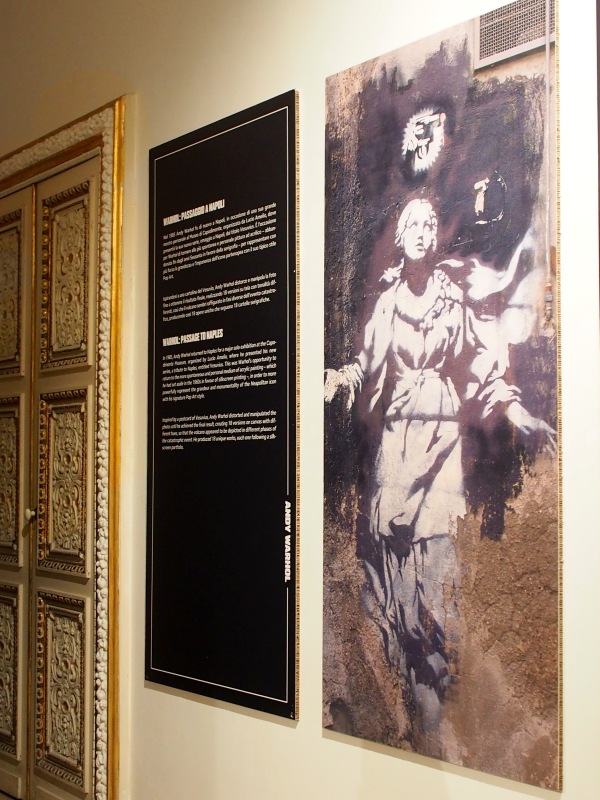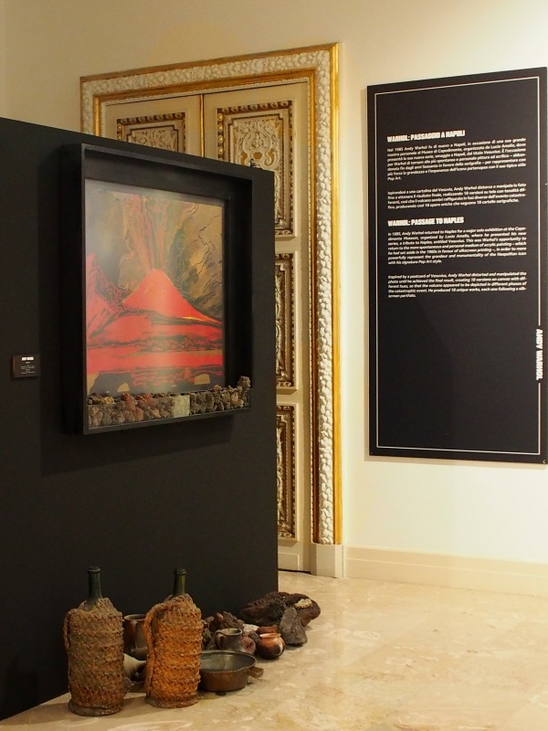 Andy Warhol americano, su invito di Lucio Amelio arriva la prima volta a Napoli nel ’75 e la trova simile a NY, racconterà: “Napoli come New York è una città che cade a pezzi e nonostante tutto la gente è felice, come quella di New York”. Nell’80 per il terremoto in Irpinia realizza l’opera “Fate presto” che darà l’avvio alla collezione Terrae Motus insieme ad altri artisti intervenuti; nel 1985 porterà la sua visione del Vesuvio al Museo di Capodimonte per una personale che resterà storica e che vedrà 18 visioni differenti del Vesuvio, che daranno vita a 18 cartelle serigrafate. Ed è proprio il Vesuvius di Warhol che nella prima sala in una installazione corredata da pietra lavica e vasi vesuviani introduce alla mostra, nella quale i suoi lavori si intrecciano con l’esperienza artistica di Banksy, e con quella dei loro passaggi nella città di Napoli.