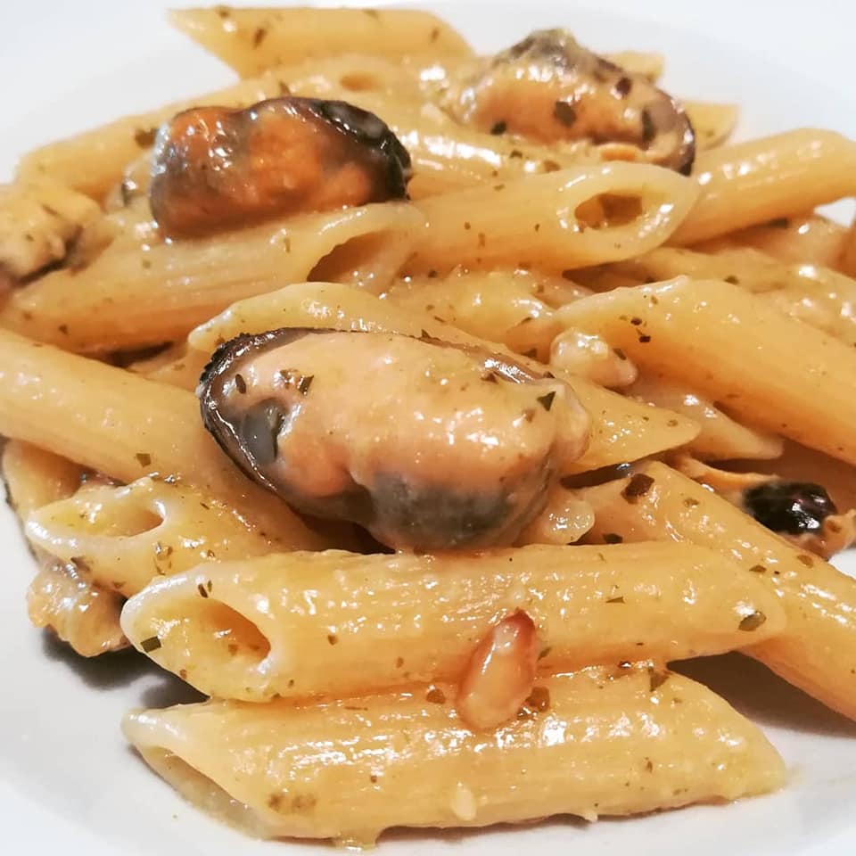 Preparazione: in una padella con un po’ di olio evo imbiondire uno spicchio di aglio, toglierlo e mettere le cozze, farle aprire, sgusciarle e tenerle da parte. In un’altra padella pulita mettere un filo di olio evo e far andare i pinoli fino a farli leggermente dorare, aggiungere le cozze, un po’ di acqua calda, un pizzico di pepe, prezzemolo, il pesto, il pecorino e una spolverata di pangrattato e far insaporire tutto. Cuocere la pasta, scolarla ed amalgamarla in padella con il composto.