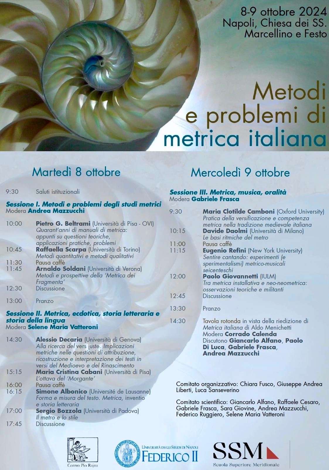 A Napoli, dal 8 al 9 ottobre 2024, nell’ex chiesa dei SS. Marcellino e Festo in Largo San Marcellino al civico 10, si terrà il convegno “Metodi e problemi di metrica italiana”, organizzato nell’ambito dell’area di “Testi, tradizioni e culture del libro” della Scuola Superiore Meridionale, con il patrocinio dell’Università Federico II e del Centro Pio Rajna.