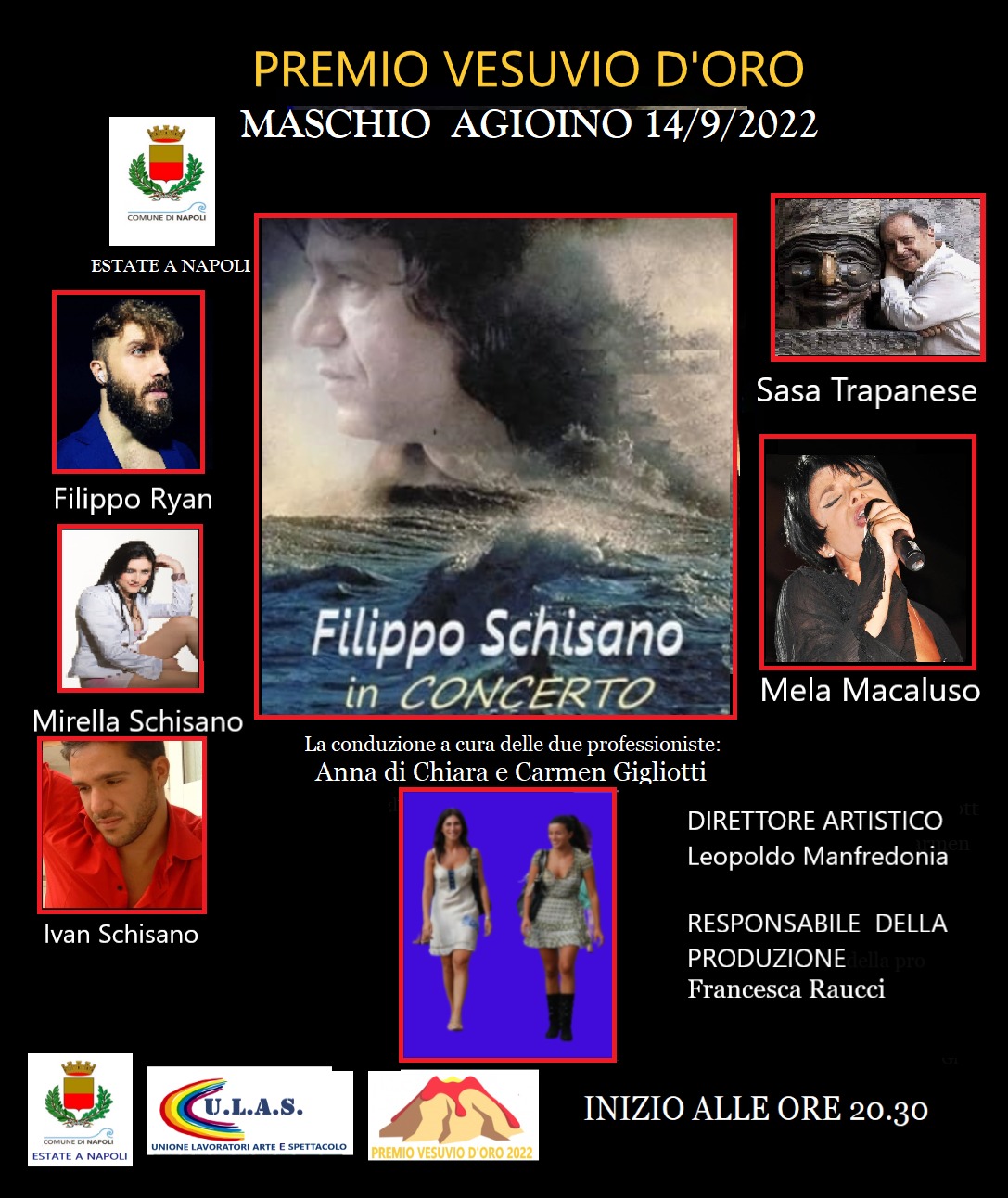 Come da programma saranno conferiti premi a personaggi illustri: per il giornalismo Claudio Ciotola e per lo spettacolo Sasà Trapanese. Nello splendido scenario del cortile simbolo della città di Napoli al Maschio Angioino. Responsabile della produzione Francesca Raucci e direzione artistica del grande, unico e instancabile Leopoldo Manfredonia.