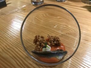 Vedere e mangiare: per Antipasto, “A zuppa e’ cozze secondo Nia”: una Cozza finta composta da pastella di alga nori fritta e disidratata, all’interno mousse di cozze, sopra un’aria di mare. Tentacolo di polpo quale interpretazione del giapponese takoyaki. Polpetta di polpo all’insegna della rivisitazione.