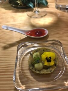 A seguire, un’alquanto originale versione in cialda di “Pasta fagioli e cozze”. Tutt’altro che il classico piatto, ma il sapore c’è tutto. Da assaporare a occhi chiusi, concentrandosi sulle sensazioni avvertite dalle papille gustative. Ingredienti; farine di grano duro e di edamame, brodo dashi, semi di papavero, crema di edamame cotto con il classico soffritto napoletano di cipolle, carote e sedano. A connotare la preparazione, l’essenza di cozze sfumate al sakè.