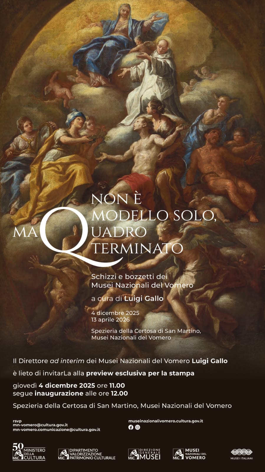La mostra “Non è modello solo, ma quadro terminato”, a cura del Direttore ad interim Luigi Gallo, ospitata nella Spezieria della Certosa di San Martino, inaugura il giorno 28 novembre. Con questa esposizione i Musei Nazionali del Vomero invitano il pubblico a entrare nella fase più viva e creativa del lavoro degli artisti: quella dei bozzetti, degli schizzi e delle idee in divenire.