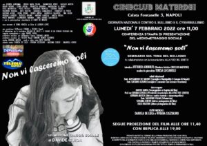 Al Cineclub Materdei di Napoli, lunedì 7 febbraio, nella giornata contro il bullismo e il cyberbullismo, appuntamento col sociale di qualità: verrà presentato in prima assoluta: “Non vi lasceremo soli”, nuovo film del regista Davide Guida.