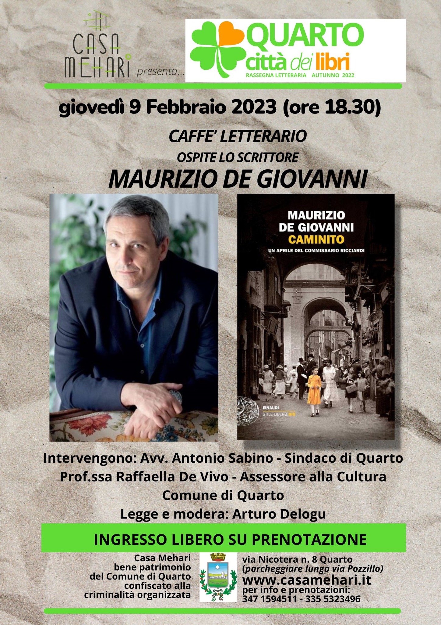 Giovedì 9, alle ore 18,30, nell’ambito della rassegna letteraria “Quarto Città dei Libri” organizzata dai gestori del bene confiscato Casa Mehari (via Nicotera 8), si terrà la presentazione del nuovo libro di Maurizio De Giovanni “Caminito. Un aprile per il commissario Ricciardi”. Interverranno il sindaco di Quarto Antonio Sabino, il vice sindaco e assessore alla cultura Raffaella De Vivo. Modera e legge brani del libro, Arturo Delogu. L’evento sarà trasmesso in diretta sulle pagine Facebook di “Casa Mehari”, “Radio Mehari” e “Dialogos Tv” per la regia di Salvatore Basile. Ingresso solo su prenotazione.