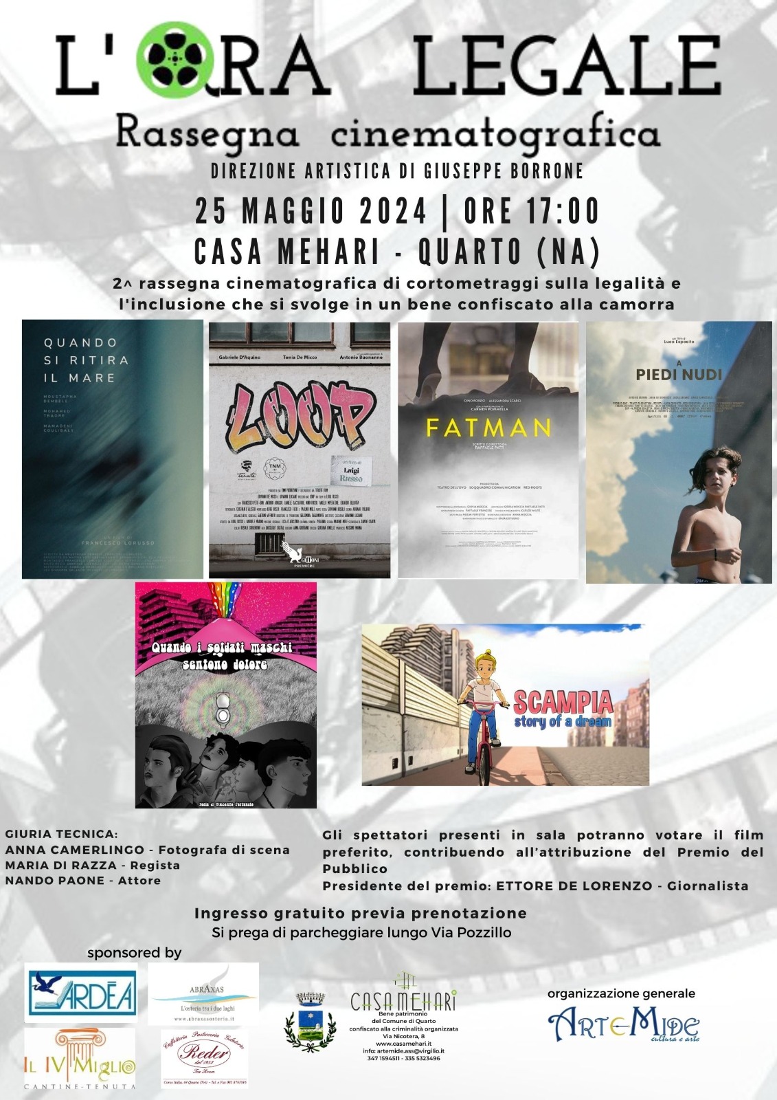 Sostenuta dall’amministrazione comunale di Quarto, la rassegna si svolgerà sabato 25 maggio 2024. A partire dalle ore 17.00 saranno presentate le opere finaliste, selezionate dallo storico del cinema Giuseppe Borrone. Seguirà, al termine delle proiezioni e di un Q&A con i registi dei film, la cerimonia di premiazione.