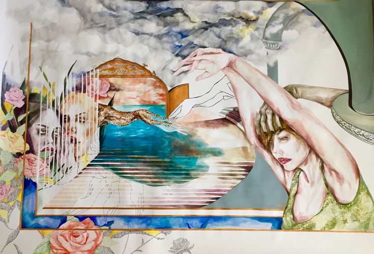 Gli eventi rendono impossibile aprire fisicamente in galleria la mostra, posticipata fino al giorno della riapertura, ma dal 24 aprile viene presentata una sua anteprima su Artland. La serie di Saghar Daeiri “Swallow – Kiss – Burn”, presentata su Artland, si concentra sulla mitologia mediorientale e sulle immagini archetipiche. Le scene sono ambientate in un giardino persiano, metafora del paradiso terrestre, in cui creature non umane si vestono con abiti non convenzionali ed hanno corpi cadenti, sovrappeso e invecchiati, lontani dalle immagini di bellezza popolare e commerciale. La deformazione fisica stride con il colore acceso e brillante e l’abilità grafica con cui sono resi i dipinti.